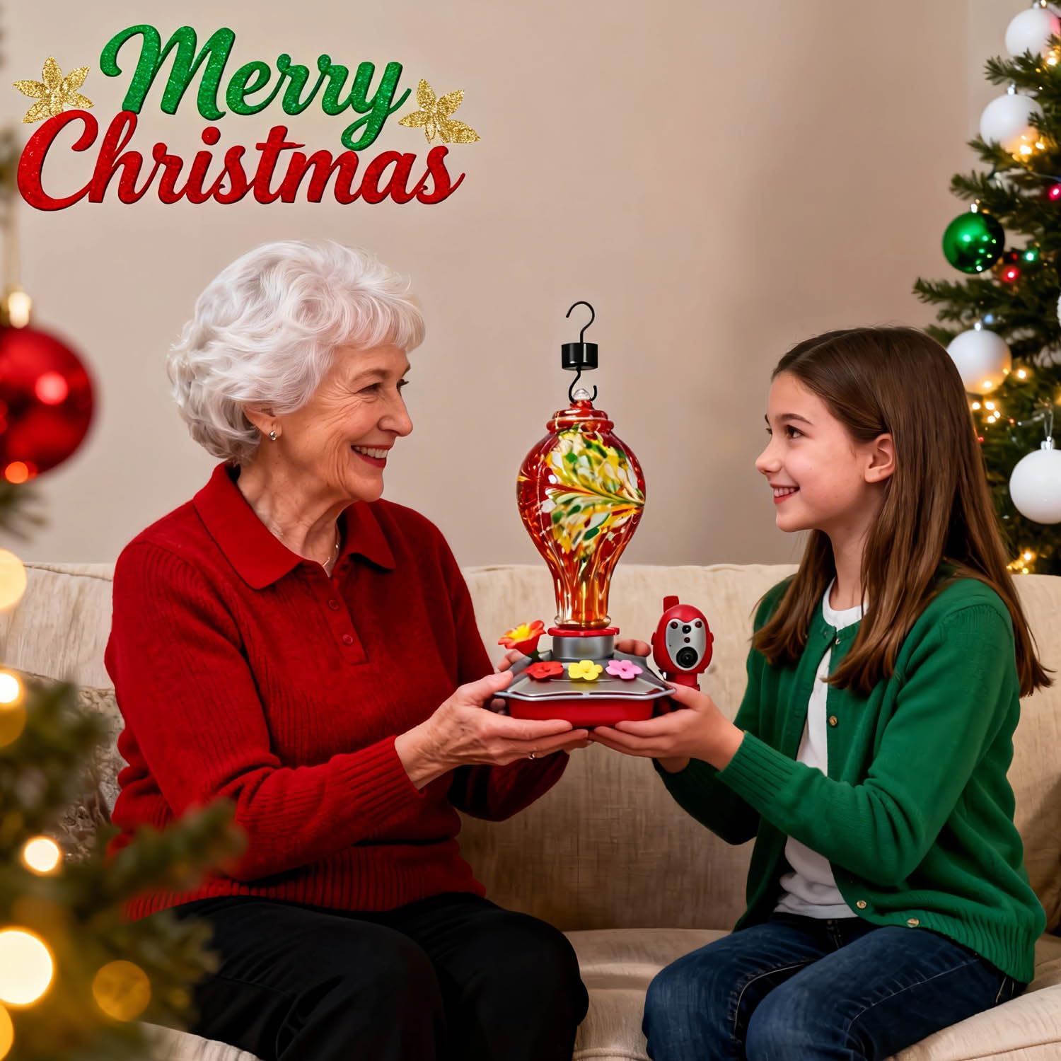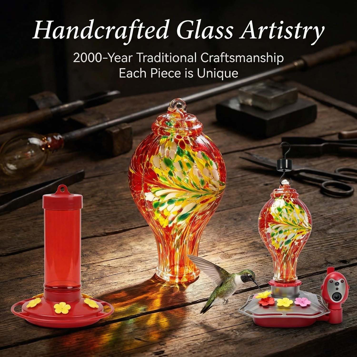 - 【Nature-Inspired Attractive Design】Crafted from hand-blown glass and eco-friendly materials, this feeder combines a flower-shaped port and a discreet bird-like camera. Beautiful and functional, it naturally attracts more hummingbirds while enhancing your garden’s charm.