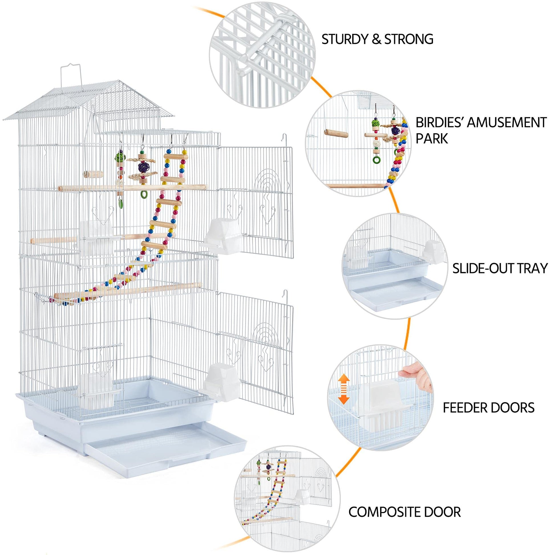 - Pet-parent friendly designs: 2 wide-open swing doors offer easy access to the inner cage, convenient for cleaning and decorating; 7 small doors are prepared for assembling feeders (included), breeding boxes and birdbaths (not included)