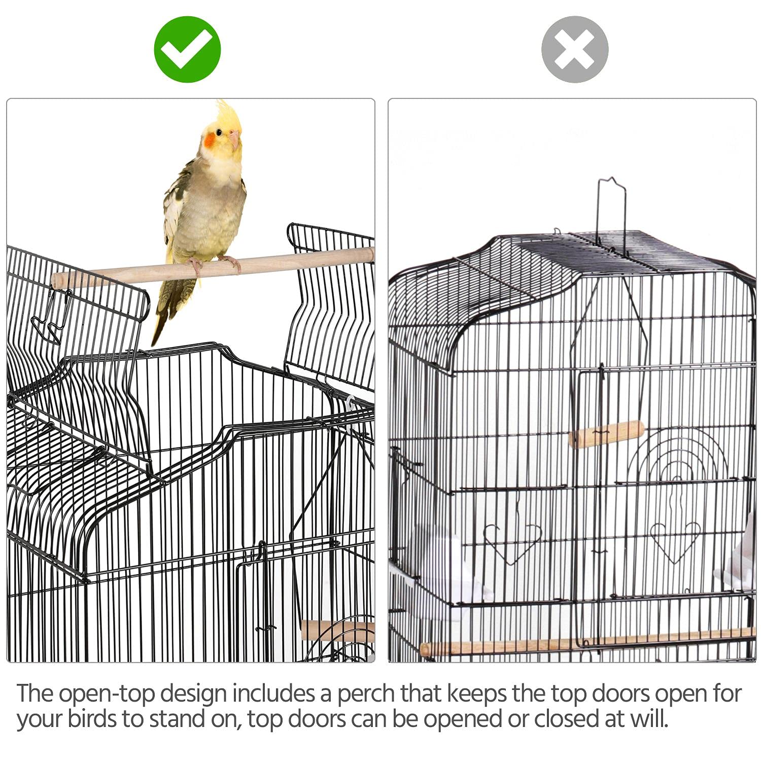- Open Top Design: To keep your bird stimulated, the roof of our hanging birdcage can be opened and locked up at will. It includes a perch that keeps the top doors open for the birds to stand on and can be closed to give them a safe enclosed home